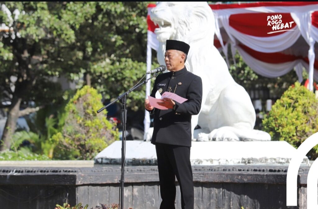 PONOROGO – Pemerintah Kabupaten Ponorogo menggelar upacara peringatan Hari Jadi ke-80 Provinsi Jawa Timur dengan penuh khidmat di Halaman Pendopo Agung, Minggu (12/10).