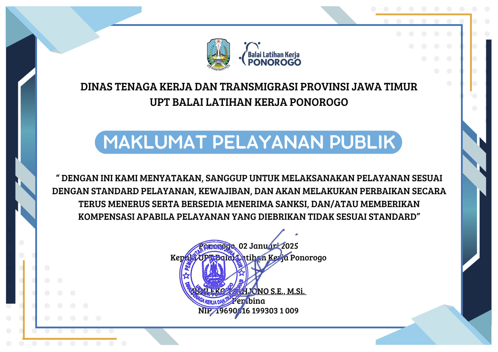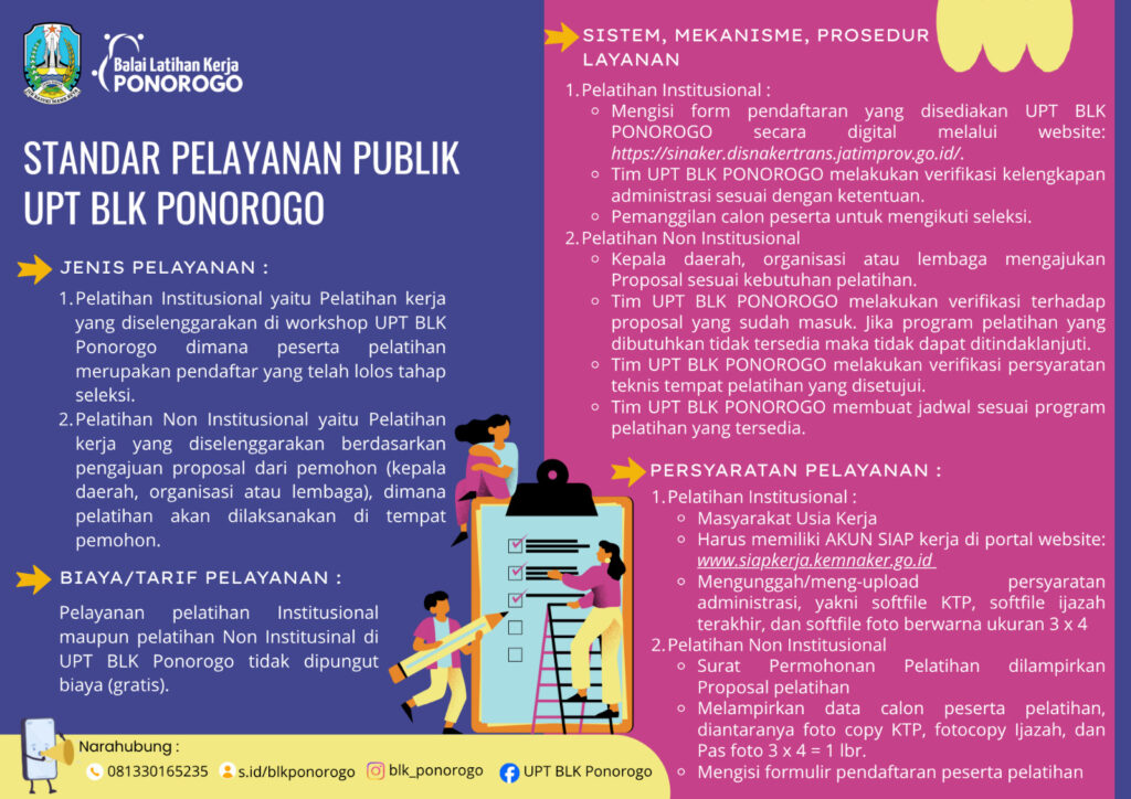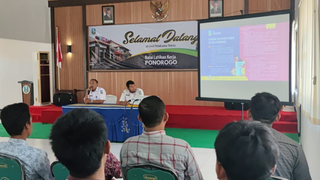 PONOROGO – Unit Pelaksana Teknis Balai Latihan Kerja (UPT BLK) Ponorogo menggelar acara peluncuran (launching) Standar dan Maklumat Pelayanan pada Rabu (15/10/2025). Kegiatan yang berlangsung di aula UPT BLK ini dihadiri oleh seluruh pegawai serta perwakilan peserta pelatihan, menandai komitmen institusi dalam meningkatkan kualitas pelayanan publik.